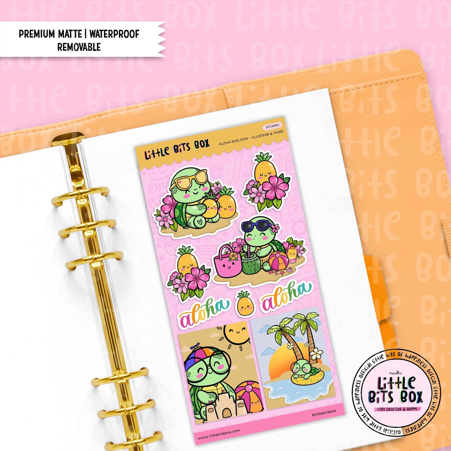 Each sheet features our lovable turtle friend, Sheldon, enjoying the sweetest tropical vibes — from sipping coconuts to lounging under the palms. Printed on high-quality matte stickers, they’re vibrant, durable, and perfect for all your creative adventures.